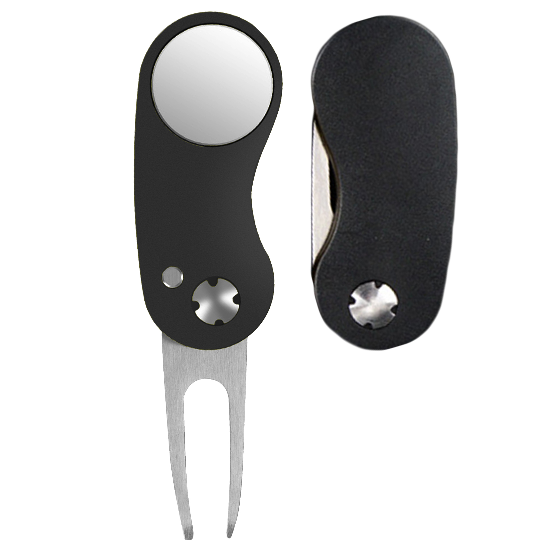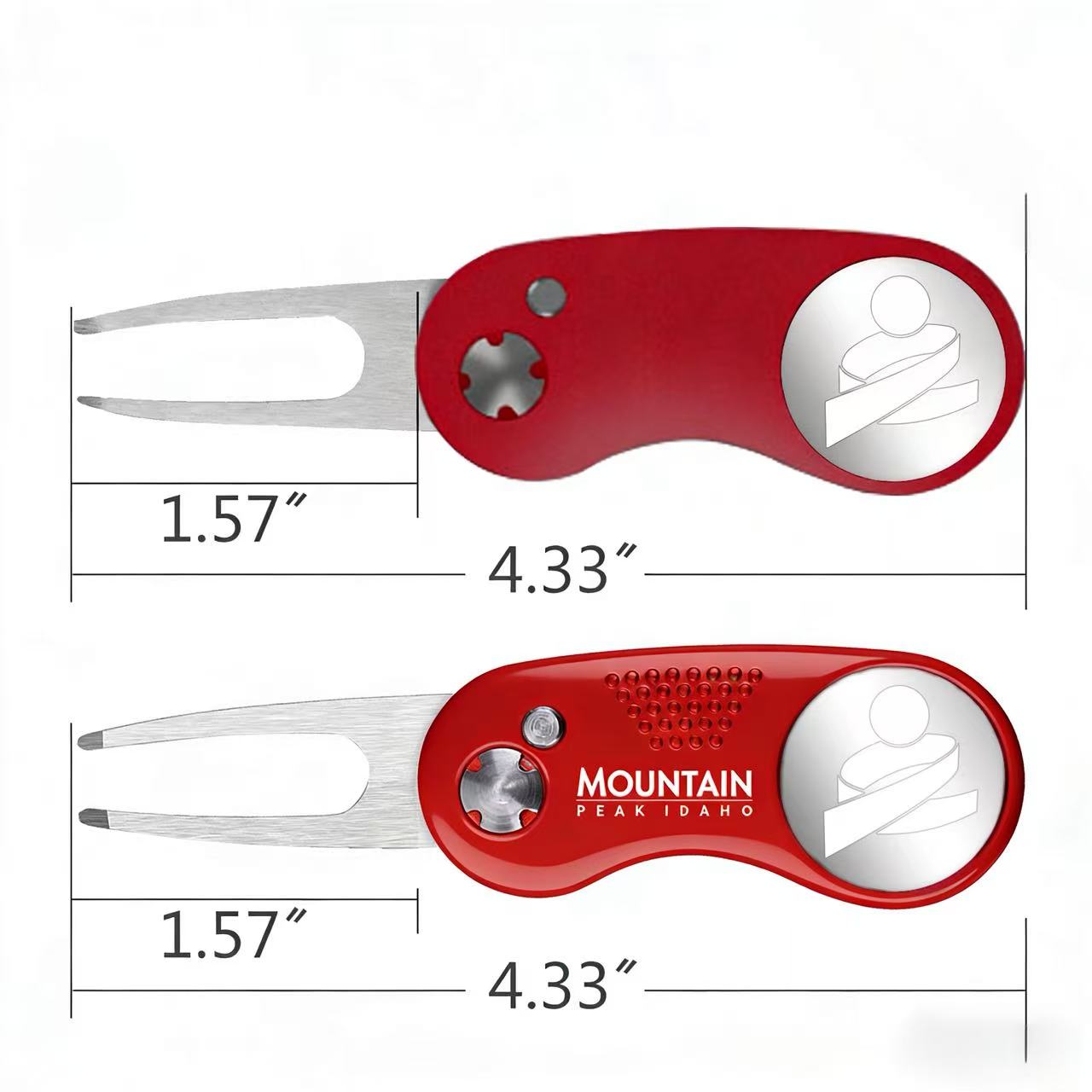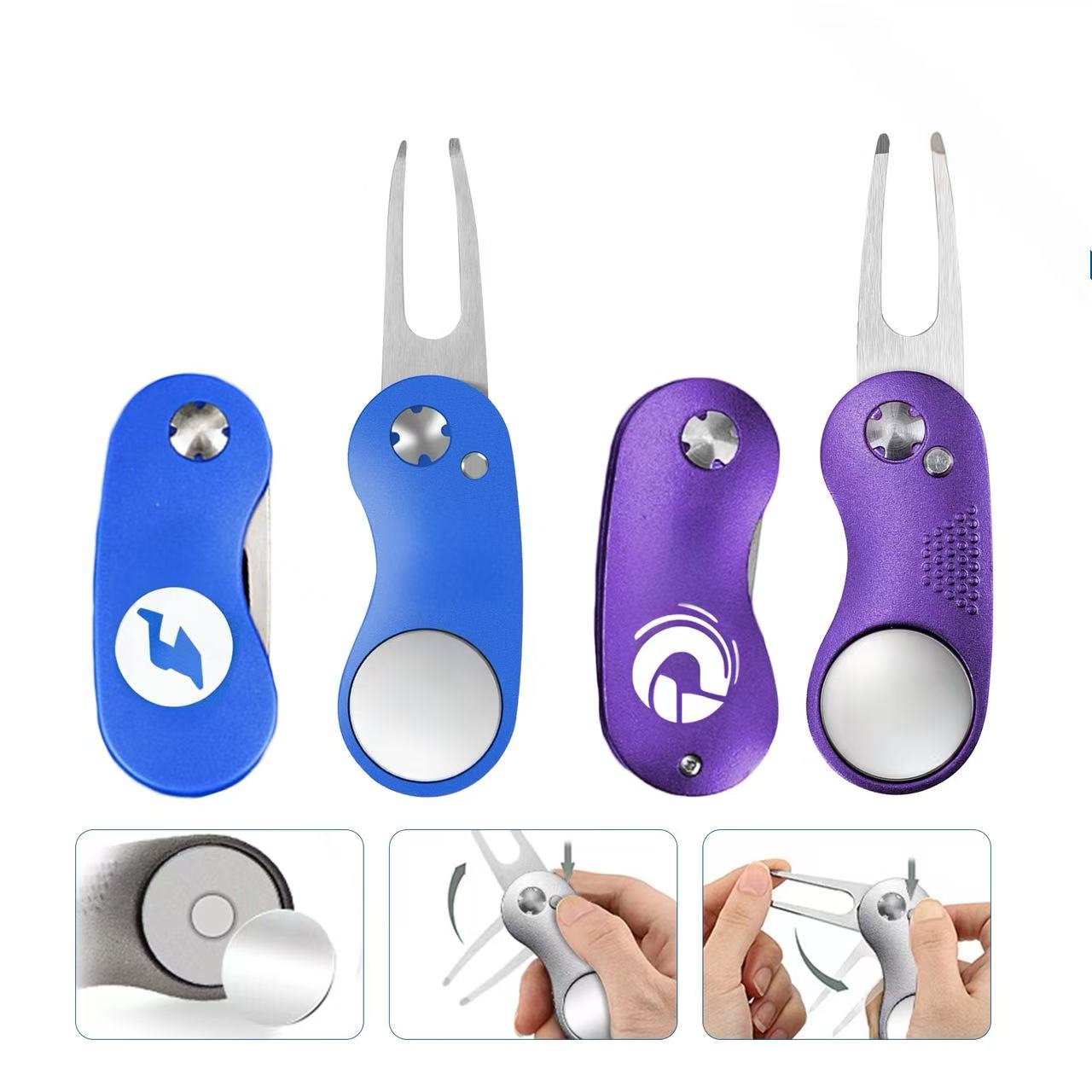 To meet your requirement, we offer 2 different materials of Kiro Foldable Ball Marker Golf Divot Tool. It becomes a switchblade action divot tool at the press of a button, perfect for fixing greens and clean the golf club surface. It features strong magnet to ensure golf ball marker attached tightly and removed easily. These divot tools are great as golf course gifts and make great handouts at trade shows or golf tournaments. The tool with ABS plastic handle with the smooth appearance will not hurt your hands, and the tool with aluminum handle is durable and solid. Standard with golf divot tool with ABS plastic handle. Premium with golf divot tool with aluminum handle available with additional charge.