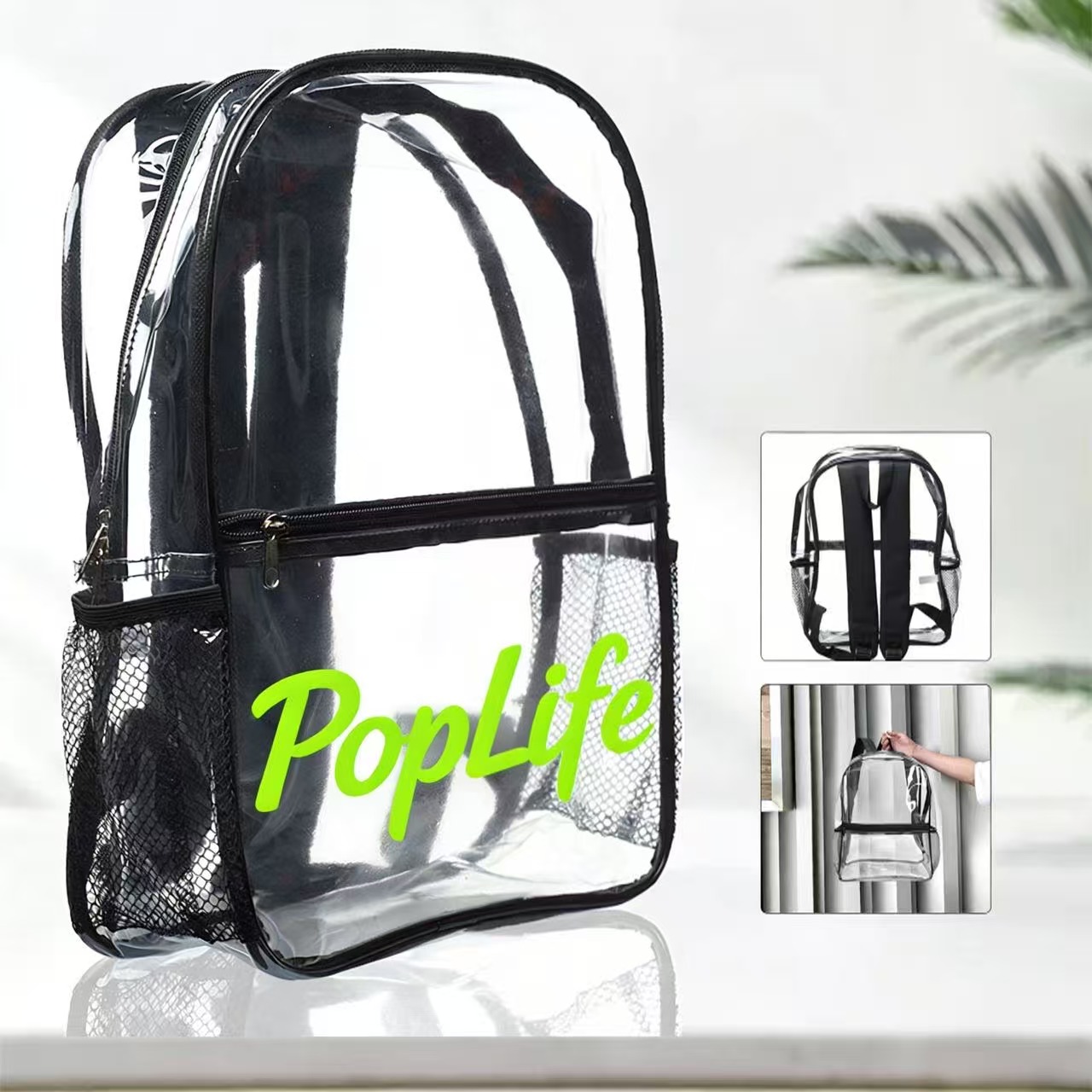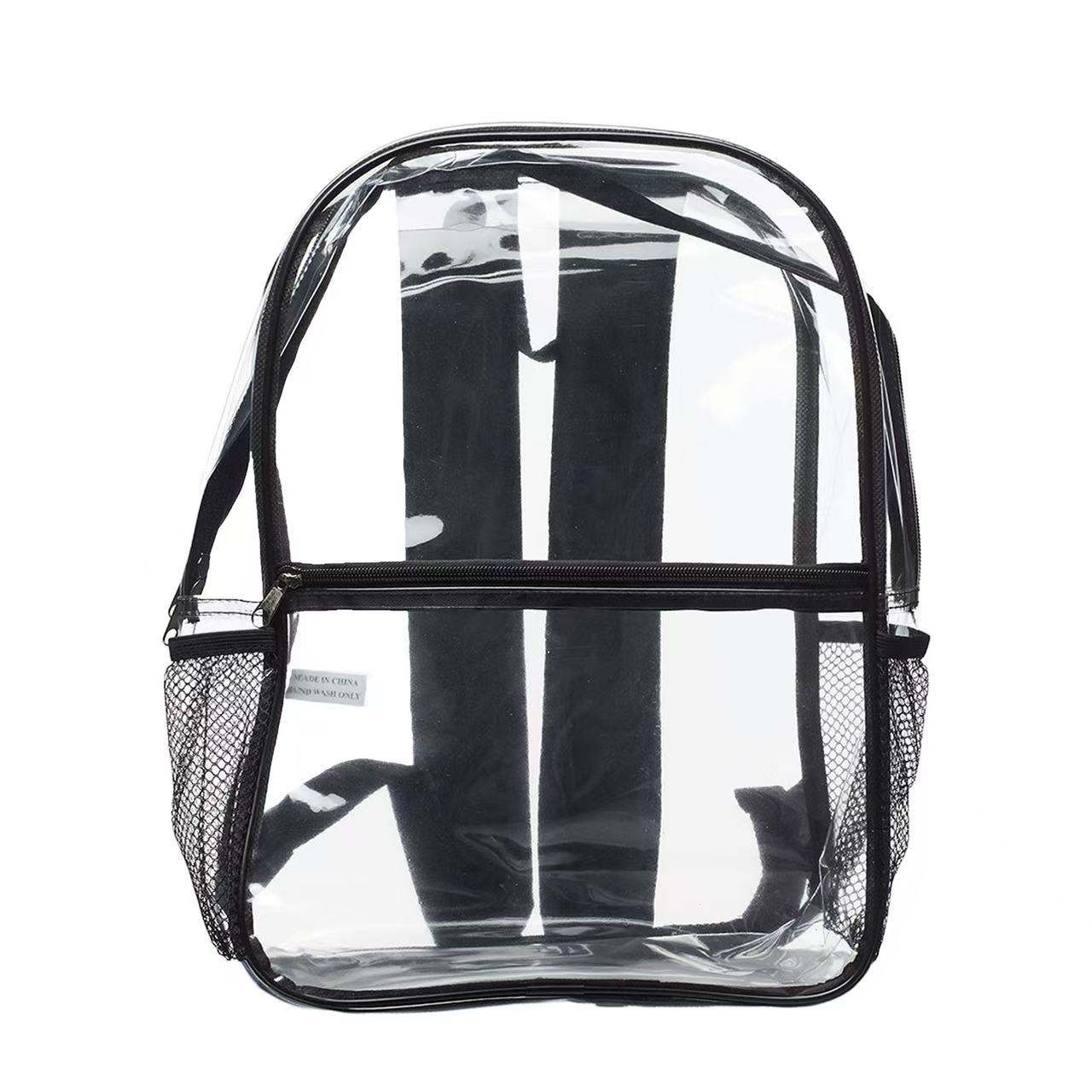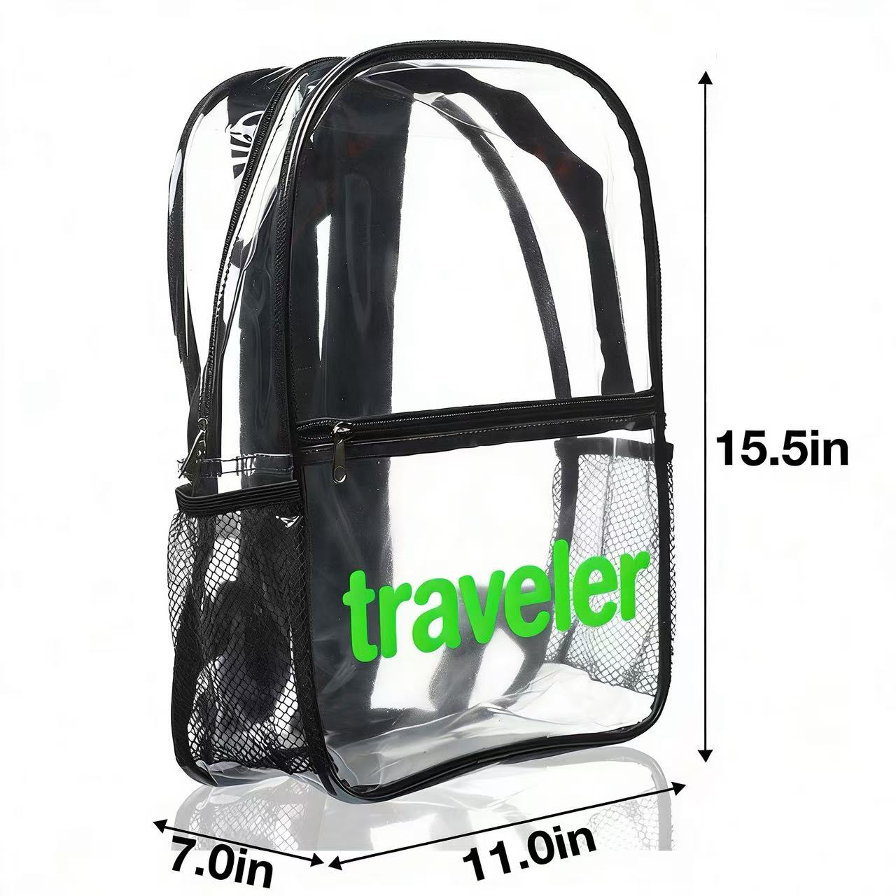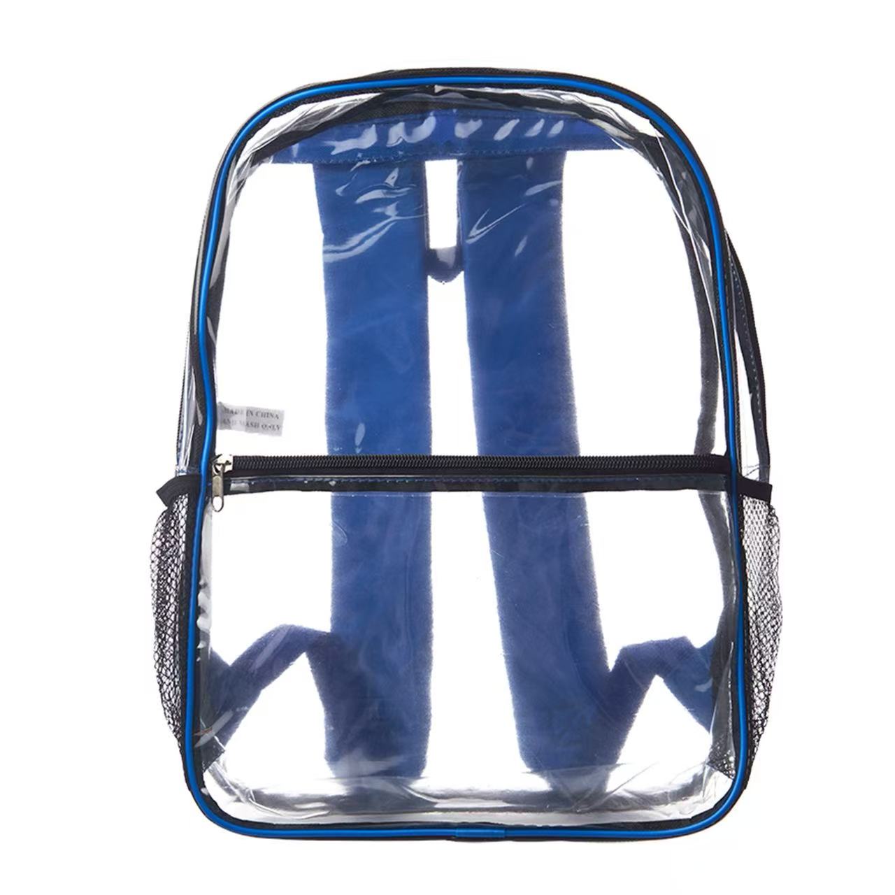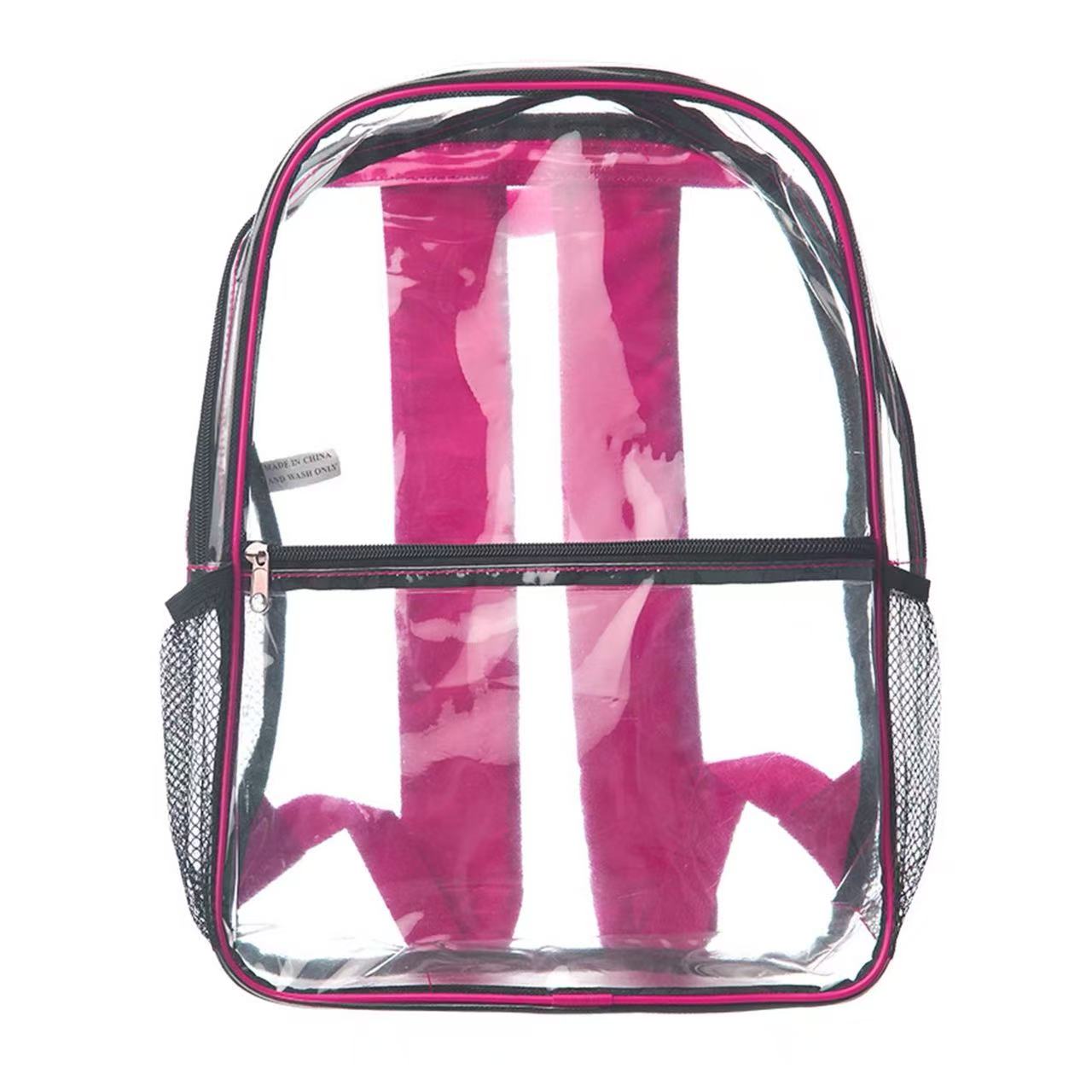 Makes check points quicker and easier. Made of PVC with 25C thickness with dual zippered design, Leith Clear Backpacks features clear zippered main pocket provides plenty of storage space for Books, travel needs. Front pocket (10.75″W X 7.50″H) ideal for snacks, pencils and other travel accessories. Two side mesh pockets fits standard water bottles,top handle for easy grabbing. Comes with padded adjustable straps for easily carrying and labor-saving. Clear material makes it easy to find things and perfect for travel as well as easy to wipe clean. 3DAYS Rush available upon request.
